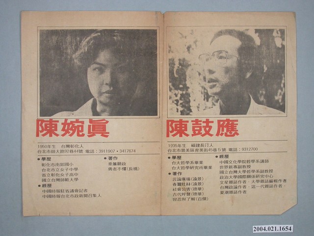 此為參選宣言,標題為「陳鼓應、陳婉真報備競選立法委員國大代表,告中國國民黨宣言」,發表日期為1978年11月,文件左下方留有兩位作者之印鑑。宣言主旨在闡述個人決意參選之動機、理念。 此為陳鼓應和陳婉真在1978年聯合發表〈告別中國國民黨宣言〉,分別競選臺北市的國民大會大表和立委,因而被開除中國國民黨黨籍,兩人在此次選舉中於臺灣大學校門口設立民主牆和發表演說,以進行選舉活動,但此次選舉因為「臺美斷交」而遭到停辦。 此物件的陳鼓應生於1935年,福建長汀人,為哲學學者,在1949年來到臺灣,並且是「臺大哲學系事件」的主要參與人之一,在此次選舉過後,前往美國加州大學柏克萊校區擔任研究員,1984年前往北京大學擔任哲學系教授,主要研究「老莊思想」。而陳婉真生於1950年,彰化人,為新聞工作者、政治人物、文史工作者,投入臺獨運動並且研究1940至1950年代的臺灣史。