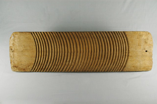 1.此為木製洗衣板,長約104公分,寬約28.7公分,高約2.9公分。器身呈長方形,中段刻有凹凸波紋凹槽以利搓衣起泡,短側邊鑿一小孔洞,可吊掛晾乾。器身有多處裂紋與黑斑,中段波紋凹槽之稜線多已磨損,兩處短側邊磨損褪色情況嚴重。2.古時人家將髒舊衣服搬至河邊或住處附近之洗衫坑清洗,將衣服置於洗衣石或洗衣板上,以木棍敲打衣服或以手搓洗,達到清潔效果。傳統生活中,洗衣對於女性不僅是家務工作,而具有社交聚會的重要功能。
