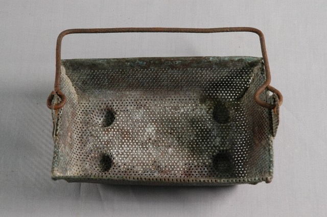 1.本件銅製肥皂籃之器身以帶有細緻孔洞的銅片製作而成,其四端角側用焊接方式固定,呈上寬下窄之長方形淺槽盒狀,器身與器底均帶有細緻孔洞,口部邊緣作圓唇樣式。籃底接近四端角處沖壓半圓球形,使底部呈現半圓球形底足支撐。口部短邊兩側帶有立耳,另以鐵條拗製呈ㄇ字形與之連接,成提樑式握把。2.本件文物主要作放置肥皂之盛器,槽底帶有孔洞可幫助瀝水,保持肥皂乾燥。臺灣早期未有洗衣機時代,一般婦女均在離家不遠之溪流、水圳或水源處旁洗衣,此盒帶有提樑把手,方便提拿。