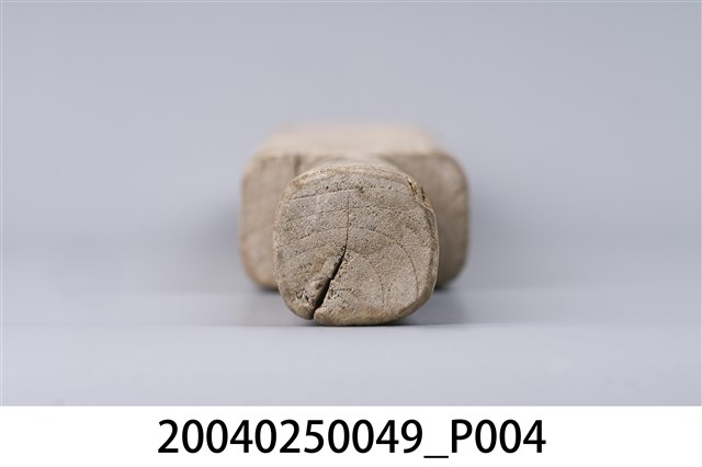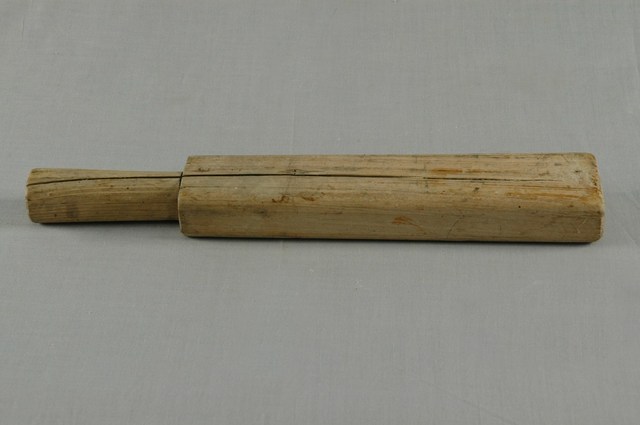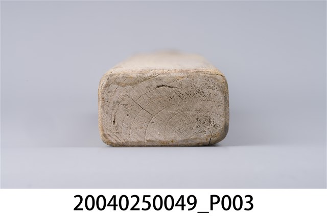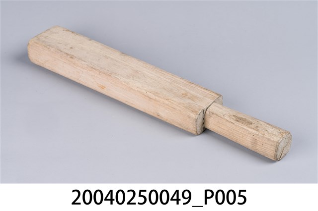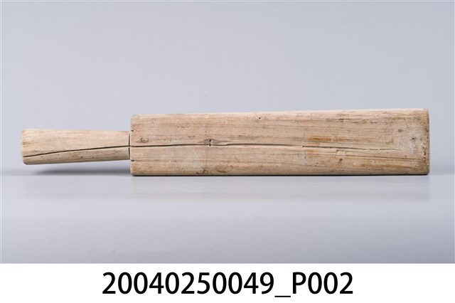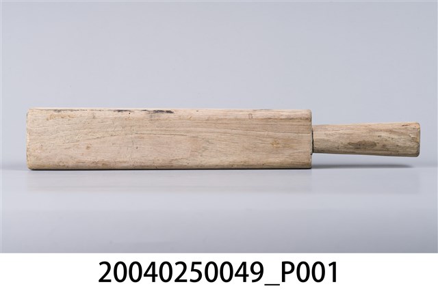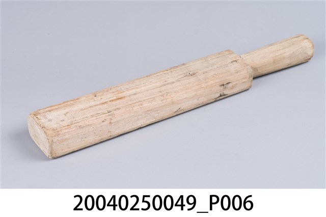 1.此為洗衣用淺褐色木棍,長約33.3公分,寬約5.3公分,高約3.1公分。器身一側呈長方柱形,用以敲打衣服,另一側為圓柱形手持處。其中一側柱面從手把至器身有深層裂痕,整體器身有多處黃褐色及黑色斑點,多有刮痕。2.古時人家將髒舊衣服搬至河邊或住處附近之洗衫坑清洗,將衣服置於洗衣石或洗衣板上,以木棍敲打衣服,達到清潔效果。傳統生活中,洗衣對於女性不僅是家務工作,而具有社交聚會的重要功能。
