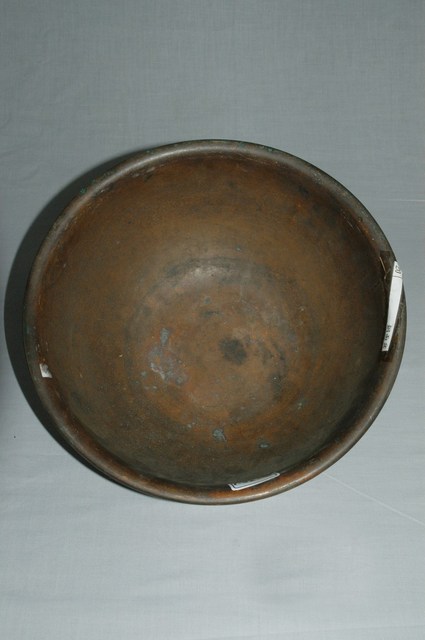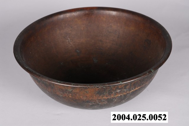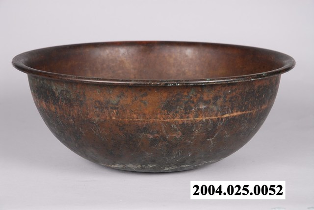 1.此為銅製面盆,長約33.5公分,寬約33.5公分,高約12.8公分。器身由銅鑄成,平底連接弧形矮壁,侈口窄折沿,殘留部分標籤紙,多已變為黑褐色。器身內側平底有多處鏽蝕,外側壁面佈滿黑褐色鏽斑,腰部有一明顯橫幅刮痕。2.傳統盥洗時,需在大灶燒熱水或於水缸盛冷水後,倒入面盆之中洗臉或洗手。面盆會搭配洗臉台,使用高度較為方便。器口較寬的面盆亦可作為嬰幼兒之澡盆使用。