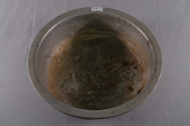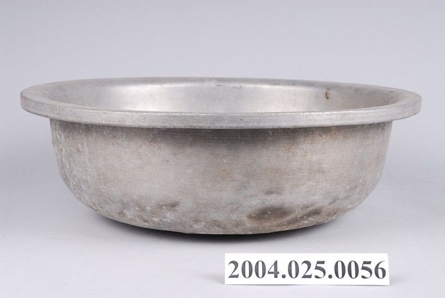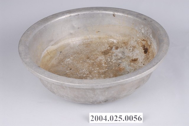 1.此為鋁製面盆,長約40.2公分,寬約40.1公分,高約13.3公分。鋁製器身,侈口淺壁平底。口緣向外延伸窄幅厚折沿。內側器底平面佈滿白色及褐色鏽斑,外側壁面近器底處有多處黑灰色內凹痕跡,整體多鏽蝕裂痕。2.傳統盥洗時,需在大灶燒熱水或於水缸盛冷水後,倒入面盆之中洗臉或洗手。面盆會搭配洗臉台,使用高度較為方便。器口較寬的面盆亦可作為嬰幼兒之澡盆使用。