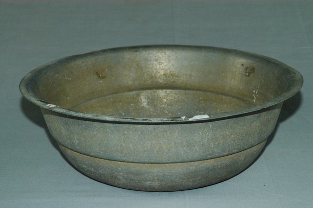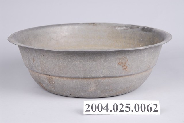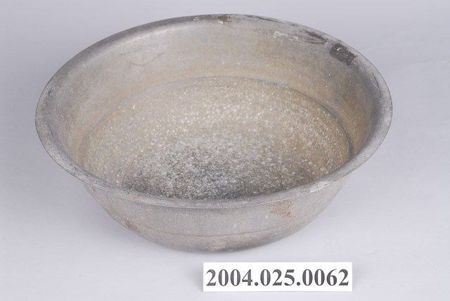 1.此為鋁製面盆,長約33.5公分,寬約32.5公分,高約11公分。鋁製器身,侈口淺壁平底,口緣向外延伸窄幅折沿,有部分凹陷及片狀黑色鏽斑。壁面內側腹部繞一圈凹痕,內側底部佈滿塊狀及點狀灰白色鏽蝕痕跡,底色為黑褐色。壁面外側有部分片狀褐色鏽痕,腹部一圈鏽蝕凹線。整體多鏽蝕刮痕。2.傳統盥洗時,需在大灶燒熱水或於水缸盛冷水後,倒入面盆之中洗臉或洗手。面盆會搭配洗臉台,使用高度較為方便。器口較寬的面盆亦可作為嬰幼兒之澡盆使用。