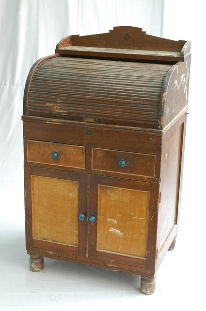 1. 本藏品是木製附臉盆架洋風矮櫃,長68.3公分、寬59公分,高118.4公分,此櫃造型簡單,頂部為幾何形山牆置物架,櫃子的上半部帶有弧形木製拉簾的檯面,櫃身則為方形,上方為左右兩個抽屜,下為對開櫃子,櫃身下有四圓形足部,整體造型簡潔。