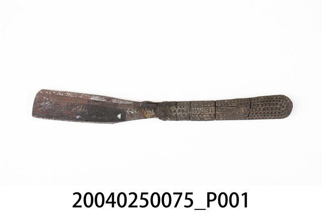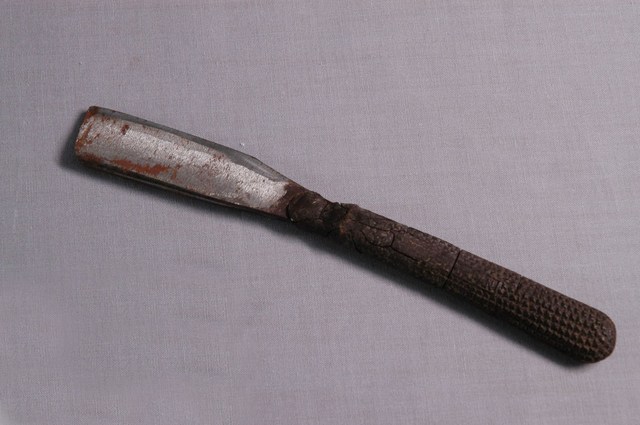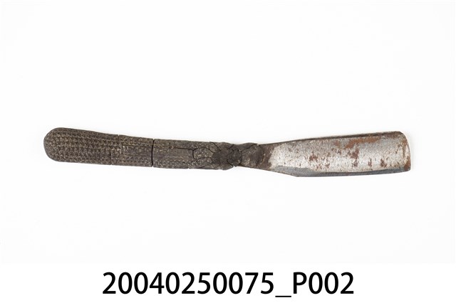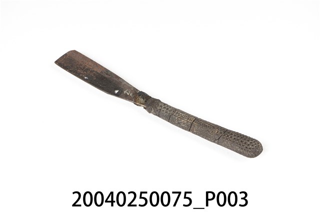 1.本件橡膠柄直式剃刀為傳統刮鬍刀樣式,可分刀身與刀柄2部分,呈長15.4公分,寬2公分,高0.9公分。剃刀通身以鐵打造而成,外型呈長直條形片狀,刀身略為寬厚,於柄部成棒狀。刀面單面帶有黑色漆料,另一面則呈金屬亮銀色澤,雙面皆略帶褐色鏽斑。於長邊兩側作單斜面,呈單開鋒樣式。刀柄部分套入深咖啡色之橡膠刀柄,柄面以細小五芒星分布作止滑功能,兩側面印有字樣,一側僅能辨識「JAPAN」,另一側為「MADE IN □□□□」。橡膠製刀柄目前已硬化脆裂,表面帶有數道裂紋。2.傳統的刮鬍刀具為直式剃刀,由於剃刀過於鋒利且難以自行處理,男性大多需要到理髮店鋪請專業的理髮師修整鬍鬚,除修整鬍鬚之外,還可作剃髮使用。