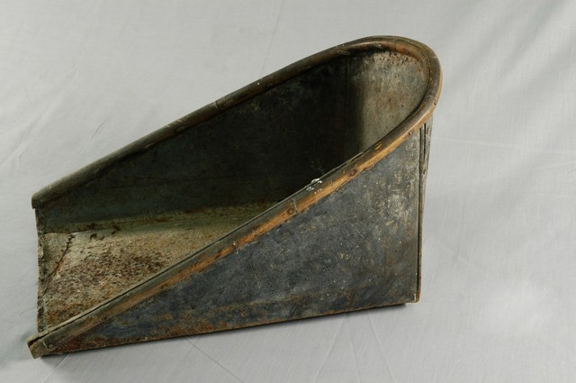 1.鐵製畚斗,平底,前低後高如鏟子形狀,由四片鐵板拼接製成,底為長方形,左右二側為三角形,背板上方呈圓弧狀,上半部可見四顆圓形鉚釘。畚斗上緣以二條粗籐包覆,避免拿取時手被鐵片邊緣割傷。整體呈鐵灰色,底部和背板可見暗褐色鏽斑。2.畚斗是清潔用的工具,常與掃把一同使用,用來盛放灰塵和垃圾。