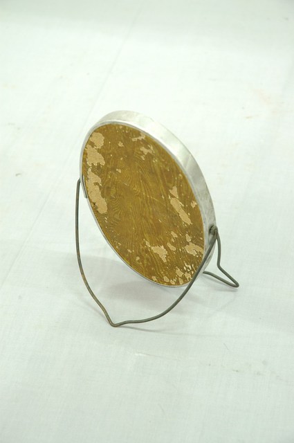 本件橢圓形桌鏡可分為鏡身與鏡架2部分,呈長11公分,寬16.2公分,高1.5公分。鏡面呈直式橢圓形,背面以紙作襯,表面貼上木紋貼皮作裝飾,貼皮現已斑駁破損。外框部分以鋁片拗折包覆外緣完成。鏡架部分以2根錏鉛線分別拗製成ㄩ字形與U字形,鏡架兩端均固定於鏡身邊框兩側邊,ㄩ字形底邊拗折成波浪三角形,U字形則於底端中央處作三角形突出。使用時將鏡架打開作倒V形,即可放置於桌面,並依照需求調整鏡面角度。該桌鏡主要作梳化鏡使用。
