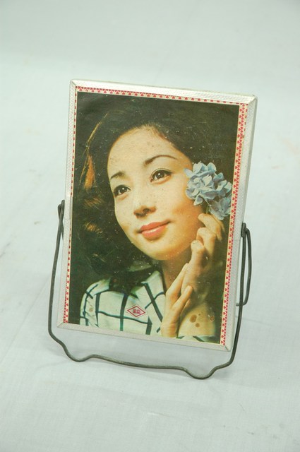 本件明星照長方形桌鏡可分為鏡身與鏡架2部分,呈長13.1公分,寬19.3公分,高1.3公分。鏡面呈直式長方形,背面以紙作彩色印刷,將明星正面胸像照片印於表面,照片四周另以紅色3瓣葉紋枝排列作框,於中央偏下處以紅色印刷外層花口菱形框,內框為粗線菱形框作標誌,內有「福」字樣。桌鏡邊框則以長條形鋁片拗折包覆完成。鏡架部分以2根錏鉛線拗製成ㄩ字形,1件底邊拗折突出三角形,另1件則於兩端作半圓形突出。使用時將鏡架打開作倒V形,即可放置於桌面,並依照需求調整鏡面角度。該桌鏡主要作梳化鏡使用。
