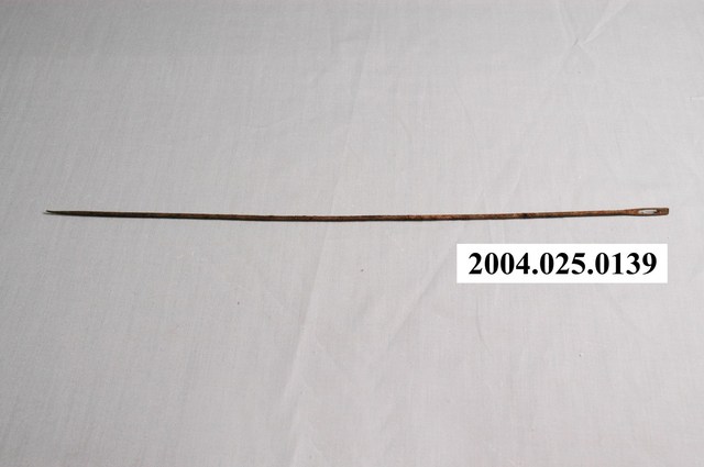 本物件為鐵製細長針,長針針孔較細長,通常用於手工編織、刺繡,其堅韌度亦較短針為佳。
