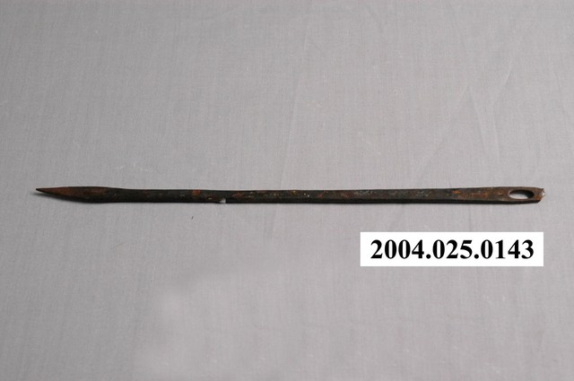 本物件為鐵製縫針,針呈扁狀,針孔較大,用以穿入毛、麻等較粗的織線。