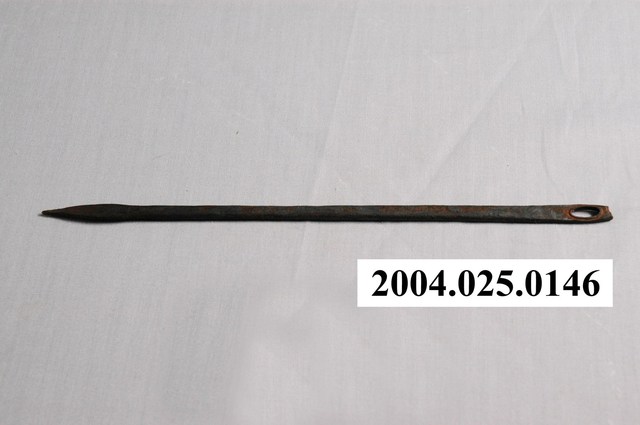 本物件為鐵製縫針,針呈扁狀,針孔較大,用以穿入毛、麻等較粗的織線。