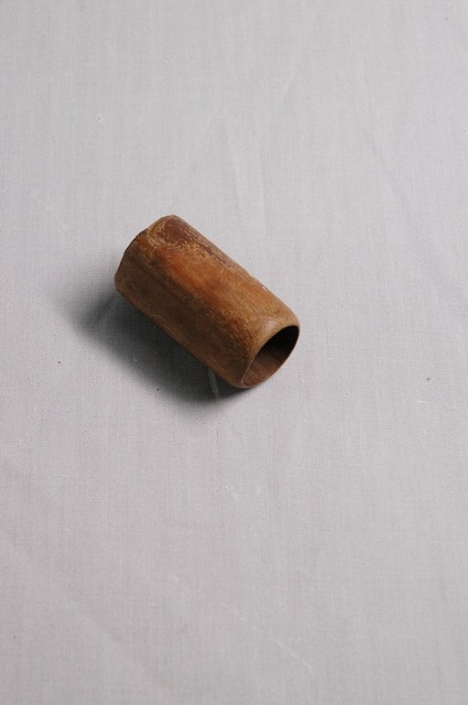 本物件為籐製指套,縫製時手指套入,用以頂針,避免針刺受傷。