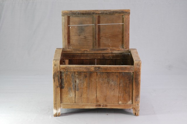 本藏品為蓋頭櫃,長66.3公分,寬36.6公分,高44.3公分。整體成方形,下方有短足。以方形木材為框,直式木板拼接成箱體,木板拼接處明顯可見空隙,整體皆以榫卯接合。上方櫃板與櫃體間有破損痕跡,疑原有鎖具。上方櫃板可上掀,櫃板底面可見縱向方材,使得櫃面得以承重,也因此這個櫃子亦可作為坐具使用。整體造型簡單質樸,做工粗獷,通體不上漆,亦無裝飾,給人實用之感。
