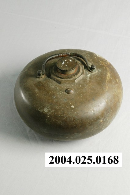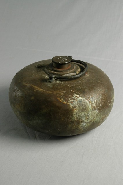1.本件銅製暖水壺通身以銅合金製作,可分為壺蓋與壺身2部件,壺身造型呈鼓腹圜底的略為扁形的球狀體。口部構造以八角形銅片為底,中央作細短頸開口,口部作螺旋形槽線利用旋轉方式密合壺蓋。壺身面帶有鐵製提樑式手把。2.暖水壺為冬天保暖取暖的銅製熱水容器,使用時於上端注水口注入熱水,透過較易導熱的銅材質取暖。取暖時外層需包裹大毛巾或布毯,避免接觸燙傷,可於就寢時放置棉被內溫被入睡。