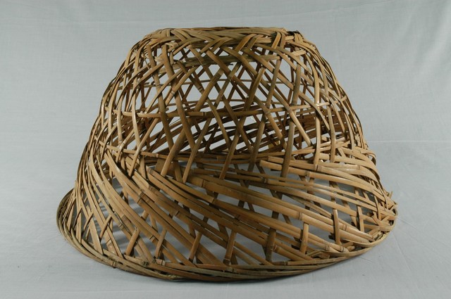 1.本物件為竹編雞罩,以竹篾編織而成,稍微呈圓錐狀,底部為開口,可貼平地面,上方口徑較窄,頂端同有開口。 2.雞罩,是由竹篾或鐵絲編織成覆鐘形,周圍留有孔目,頂物有一圓孔,可用來放置飼料及捉取家禽,通常都用來飼養幼小的家禽。
