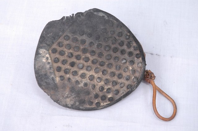 1.本物件為牛鞋,為橡膠材質,成類橢圓狀,前端較鈍,後端較尖,前後端各有一片狀突起,前端突起較高可置於牛蹄之間,兩個突起處皆有穿孔,有繫上粗棉繩,繩外裝有塑膠管。平面處有一圓形商標,內有一牛頭圖案,周遭有「台中」、「特」等字樣。底部有許多圓點凸起可增加摩擦力。