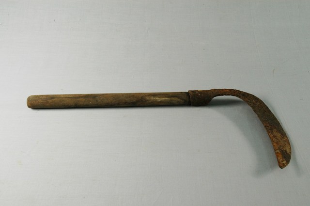 本文物為鐮刀,主要為收穫用農具,也在山林活動使用。本件鐮刀刀身較短,且與刀柄垂直,用途包括修細枝、砍竹管或甘蔗,或小面積的割草、割瓜果藤蔓等。鐮刀基本形式為彎月形鐵片,內緣為刀刃。本件刀片後端作成圓筒狀箍以置入木柄,為為傳統漢式農具作法。根據購藏來源資料,本件文物來自花蓮。