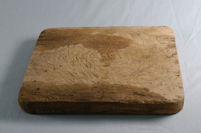 本物件為舊切豬菜砧板,為木質,長方形樣式,為原木切割而成,表面有刀痕,有污漬、缺損。
