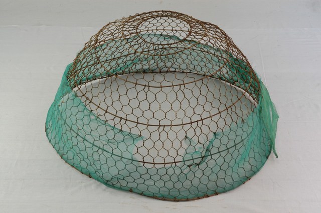 1.本物件為鐵絲編雞罩,主要用為圈圍較小的仔雞,鐵絲編織,呈圓錐狀,底部為一開口,上方較尖,有一小開口,底部周圍圍有較密的綠色網子。 2.雞罩,是由竹篾或鐵絲編織成覆鐘形,周圍留有孔目,頂物有一圓孔,可用來放置飼料及捉取家禽,通常都用來飼養幼小的家禽。