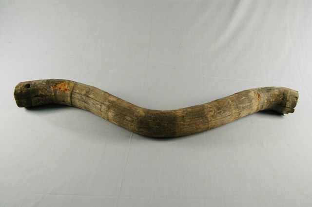 1.本物件為牛擔,由竹根製成,整體呈中高兩側低的曲線,可架於牛背上,兩側又有些許上彎,可繫上牛繩。 2.牛擔,又稱為牛軛,將其馱於牛頸上,並於兩端繫上繩索,可利用繩索來牽動犁、耙或牛車。