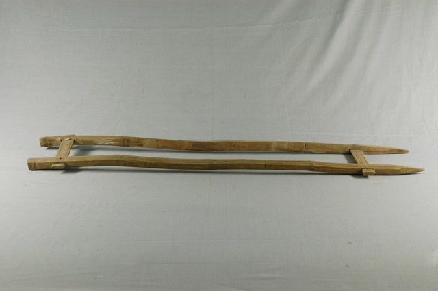 1.本物件為秧架,為竹材質,由2長2短竹條,以榫接方式組成長方形竹架,一側之長竹條突出處皆有削尖,另一側則皆有磨平。