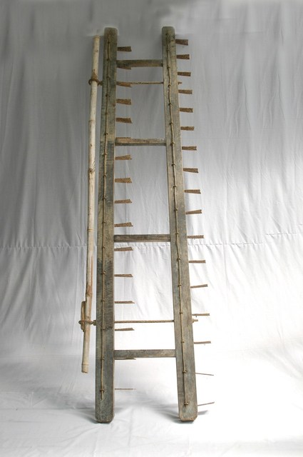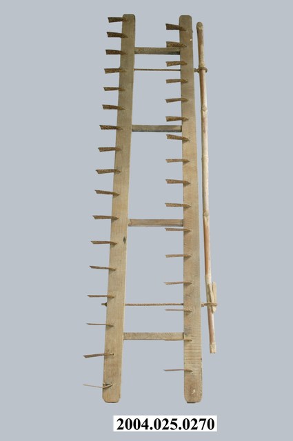 1.本物件為刈耙,為木及金屬材質,2長木棍上有鐵刀,前為16刀,後為17刀,共33刀,兩棍間由4短木棍連接,鐵刀前後成交錯,前木棍有兩鐵環穿有一竹竿,鐵片、鐵環有鐵繡。 2.刈耙是割鬆田地之用,由於地形不一,田的大小不同,因此刈耙的刈刀多寡亦不同,一般最少是前3刀、後4刀共7刀,因此有7刀、9刀、11刀、13刀、15刀、最大的是33刀。