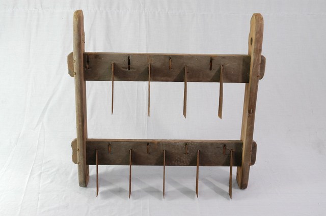 1.本物件為刈耙,為木及金屬材質,2長木板上有鐵刀,前為4刀,後為5刀,共9刀,2木板外側以另2木板榫接方式連接,鐵刀前後成交錯,鐵片有鐵繡。 2.刈耙是割鬆田地之用,由於地形不一,田的大小不同,因此刈耙的刈刀多寡亦不同,一般最少是前3刀、後4刀共7刀,因此有7刀、9刀、11刀、13刀、15刀、最大的是33刀。
