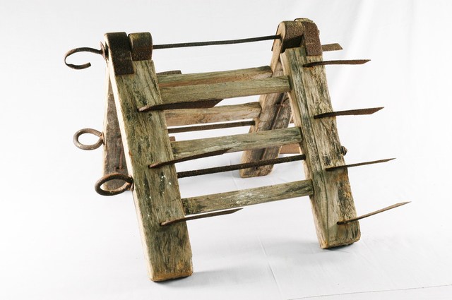 1.本物件為折疊刈耙,為木及金屬材質,為2較短小刈耙,由鐵棒為軸連接而成,小刈耙上有鐵刀,前3刀,後4刀,共7刀,前後鐵刀成交錯狀,2刈耙展開後會變成前6刀、後8刀的大刈耙,鐵刀有鏽蝕情形。 2.折疊刈耙,為金屬及木材質,因其可自由折疊,又有軟骨刈耙之稱,以鐵棒為軸將兩刈耙連結。