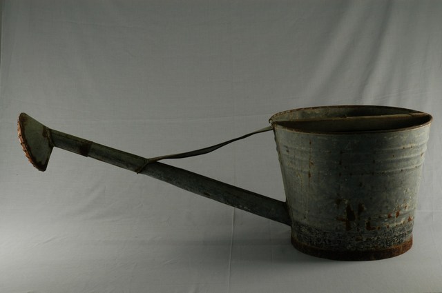 2.灑水桶一般俗稱為「潠桶」,由於裝水量有限,是一簡單的灌溉器具,可用於農地、菜圃、花園等居多。本件為鋁皮製成,使用得宜壽命可達5至10年。其構造與水桶類似,再加上橫槓、繩索,便利挑負。使用時盛水於桶內,通常以兩桶為一組,邊行邊將挑運的扁擔向前傾,水即由撒水成扇狀噴出。