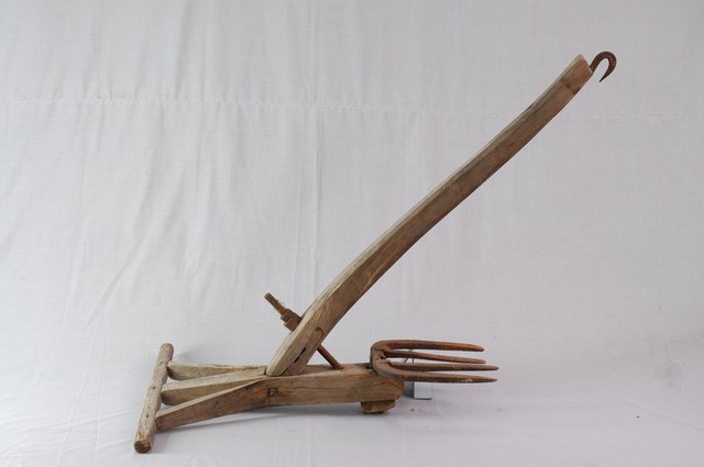 1.本物件為四齒犁耙,為木質及金屬材質,外型與犁相似,犁尾及犁轅為木質,犁轅前端有一鐵鉤,可做祭繩索用,犁頭的部分更換為四齒耙。為金屬材質,金屬材質部分有鐵銹情形。 2.用以整平田面,收集雜草。