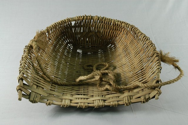 1.本物件為竹畚箕,為竹及藤材質,將藤條折成「U」字型,以竹編成一邊平一邊圓的容器,兩旁繫有麻繩。畚箕形似畚斗,無耳。 2.畚箕,通常用竹片編織而成,用來裝較小物體的竹容器,依其編織密集程度不一可用來搬運米、砂等較細小物體或番薯、石頭等較大物品,後來則出現以鐵片製成的鐵畚箕。