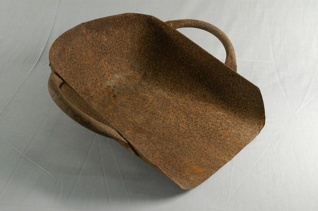 1.本物件為鐵畚箕,為金屬材質,主體由鐵片製成,兩側各有一把手,有鐵管彎曲,以螺絲連接主體,整體有鐵鏽情形。 2.畚箕,通常用竹片編織而成,用來裝較小物體的竹容器,依其編織密集程度不一可用來搬運米、砂等較細小物體或番薯、石頭等較大物品,後來則出現以鐵片製成的鐵畚箕。