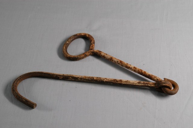 本物件為鐵鉤,為金屬材質,由兩段鐵棍連接而成,一端為圓環狀,另一端為鉤狀,整體有鏽蝕情形。