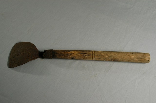 本文物為秧鏟,為1980年代農機普及前種植水稻常用的農具,以平口鐵鏟片與木柄構成。鐵鏟片後端連接鐵片,再接收捲成圓筒形箍以供置入柄,為漢人傳統農具作法,從清末至今未變。木柄則為工廠機器製成品,為1970年代以後製成。秧鏟有長柄、短柄不同,本件為短柄,通常用於水稻田。在水稻的秧苗培植至約三寸高時,需移栽到水田中。移植時,使用秧鏟將整片秧苗由秧田連根帶土成片鏟起,放置於秧披內。根據購藏來源資料,本件文物來自桃園。