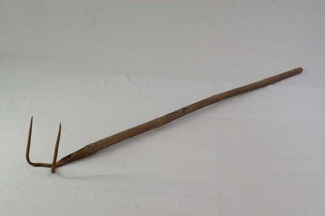 本文物為二齒耙,因有二齒而名之,為鬆土或耙集草根或藤蔓的農具。本件齒尖且長,尾端收成圓筒形箍以置竹柄。竹柄長,可用於清理、耙集遠端土表已拔起的草藤,或將土耙碎為鬆土作業。根據購藏來源資料,本件文物來自臺中。
