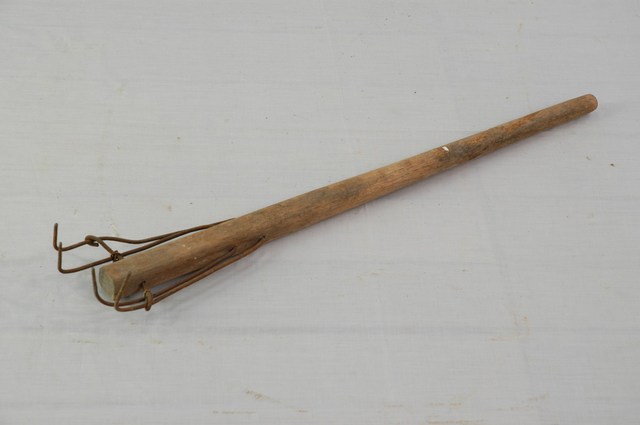 本文物為釘耙,耙有四齒,故稱四齒耙,或四齒。本件四齒耙為短柄,齒以鐵線綁成,鐵線後端穿過木柄,為使用者自製品。其尺寸較小,適合小面積菜園或花園的收集草、藤蔓等作業。根據購藏來源資料,本件文物來自高雄。