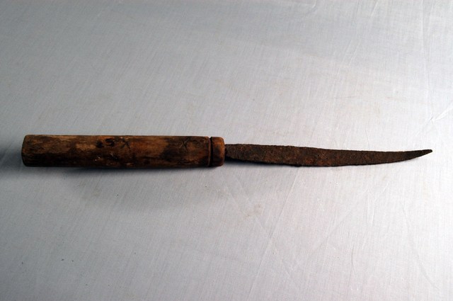 本文物可能為蠔刀,為扁平鐵條,尖端細,鐵條後端插入木柄中。木柄前端原有箍環,已掉落。使用時以尖端插入蠔殼的間隙,將殼剝開。根據購藏來源資料,本件文物來自屏東。
