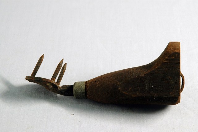 布袋鉤搭,是手鉤的一種,又稱麻袋鉤、袋鉤、三爪袋鉤。鉤頭為三爪形,專用於勾住並移動裝盛穀物的麻袋。本件布袋鉤搭鉤頭為鐵製爪形,以圓盤形上焊三鐵釘形成爪形。釘爪與木柄方向呈銳角,鉤頭後端插入木柄凹槽內,外以箍環固定木柄。木柄略彎曲,後端加粗以利握持。木柄底部做鐵環,便於掛放。本件木柄為短柄,使用於短距離勾取施力。本件袋鉤鉤頭與箍環生鏽。手鉤最早於日本時代引入,箍環外包為戰後臺灣改良做法,因此本件為戰後臺灣製品,根據典藏來源資料,本件文物收集來源地在花蓮。