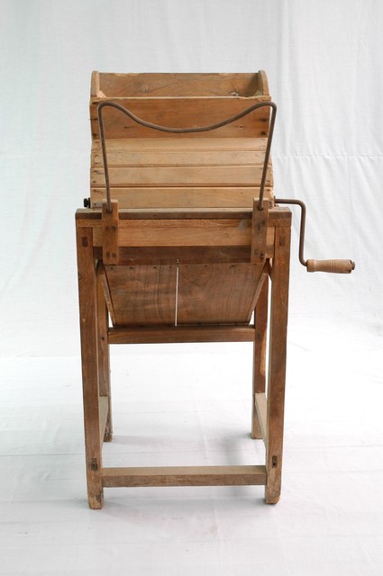 本物件為手搖花生脫殼機,主體為木製。上半部為入料斗,用以倒入花生,斗壁上印有「斗六 源利」4字,標明地區及店號。脫殼機一側為把手,用以轉動機內的轉手,將花生反覆打擊、摩擦、碰撞。機體下半部為頭皂、二皂,一側初花生仁,另一側出攪碎的花生殼。有4支木腳支撐機體。