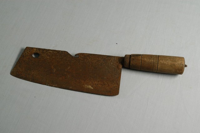 本文物為洋麻刀,用來切斷麻線的刀具,刀背上有凹溝,可將線纏繞於上施力拉即可切斷。本件文物形如菜刀,刀後端收成尖棒插入木柄中。木柄前端凹下,外箍鐵環固定。木柄為機器成型製品,為戰後所作。根據購藏來源資料,本件文物來自屏東。