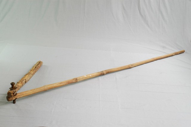 本物件為連枷,竹材質。連枷是由兩根長短不同的竹枝所組成,兩根竹枝一端以螺絲連結。其是一種農用收割工具,用於分離穀物的外殼。一根竹枝由使用者握持並揮舞,另一竹枝則對穀物進行擊打,從而使外殼從穀物上分離開來。