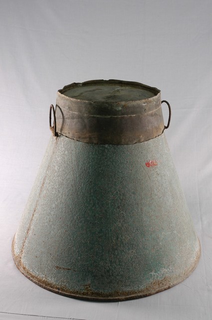 1.此物件為鐵皮製魚仔桶,是由鐵皮所製成的漁具,此物件外觀為圓桶狀但寬度朝上方收縮,魚桶頸部兩側各有一鐵製拉環。 2.魚仔桶也稱為魚苗桶,主要是用於裝載體積甚小的魚苗,有些魚苗甚至連肉眼都難以觀察到。為讓魚苗可以順利受精、孵化,一般農家多先選溫暖的室內進行魚苗的受精與孵化,待魚苗長出後,再利用魚仔桶移至魚塭等養殖區域。