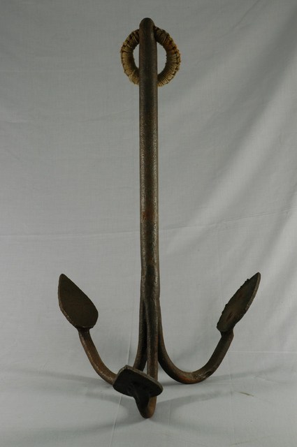1.此物件為鐵製漁船錨,外觀上為一末端分為三叉並彎起的鐵棒,每個分叉的尾端為箭頭狀設計,錨身有些許繡斑。 2.漁船錨為船隻停泊時用於固定使船隻不會被海流及風向影響而移動的工具,因需要足夠的重量,錨通常為金屬製品。