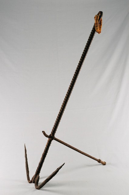 1.此物件為鐵製漁船錨,外觀上為一末端分為二叉並彎起的鐵棒,分叉的尾端為尖頭設計,於錨身頸部的位置另有一鐵棒斜向插入,船錨尾端分叉部分有些許繡斑。 2.漁船錨為船隻停泊時用於固定使船隻不會被海流及風向影響而移動的工具,因需要足夠的重量,錨通常為金屬製品。