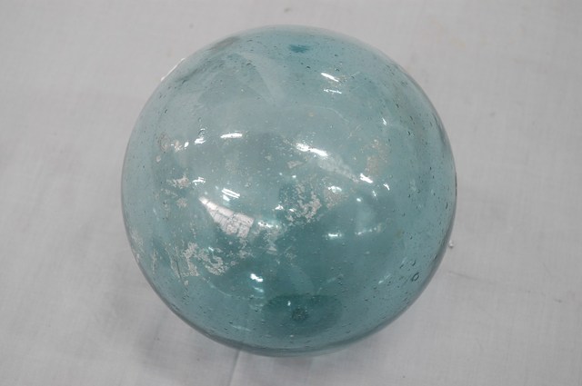 1.此物件為玻璃製魚標,外觀為一透明中空玻璃圓球,青色,圓球表面有一玻璃燒合的痕跡,且此物件的玻璃面上有許多玻璃燒製過程中留下的氣泡。 2.玻璃魚標為一種常與漁網一起使用的漁具,魚標繫在漁網上後便會浮於水面,用以增加漁網浮力以及標示漁網位置。