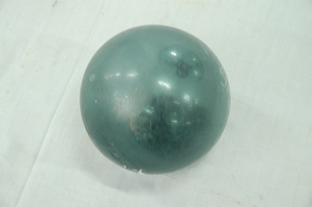 1.此物件為玻璃製魚標,外觀為一中空玻璃圓球,青色,圓球表面的一側有一玻璃燒合時留下的明顯痕跡,且圓球表面有許多碰撞痕跡。 2.玻璃魚標為一種常與漁網一起使用的漁具,魚標繫在漁網上後便會浮於水面,用以增加漁網浮力以及標示漁網位置。