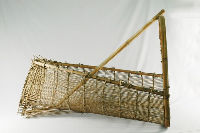 1.此物件為竹製捕魚器,是使用竹材作為骨架再加上竹篾編織部分組合而成的漁具,外觀為一竹製拱門狀骨架與一畚箕狀竹篾編織品組合,上方再加上一斜立的竹竿與拱門部分相接。 2.漏斗狀溪魚捕捉器的使用方式是放置於河流或是湖泊內誘使魚順著水流游入捕捉器內,魚會因其漏斗狀設計而難以游出方便捕魚人進行捕捉。