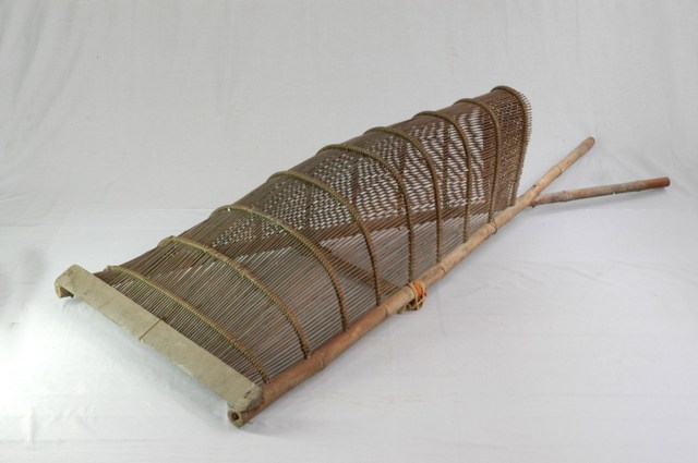 1.此物件為竹製捕魚器,為一竹竿以及竹篾編織物的組合魚具,由兩竹竿尾端相接作為骨架,上方再橫綁上一竹竿作為固定後下方與畚箕狀的竹篾編織品組合。 2.漏斗狀溪魚捕捉器的使用方式是放置於河流或是湖泊內誘使魚順著水流游入捕捉器內,魚會因其漏斗狀設計而難以游出方便捕魚人進行捕捉。