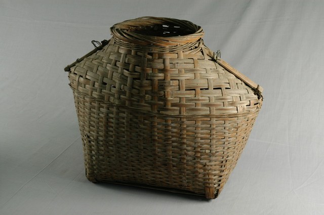 1.本物件為竹製品,呈現水壺狀,編織方式為條紋交叉編織縛紮而成,下方為方型底座,物件上方有一圓型開口,開口兩邊各有一鐵絲小耳,方便繫上背帶或手提。 2.魚簍為放置漁獲的器具,在捕魚或是釣魚時使用,籠頸處綁上細繩可繫在捕魚人的腰間隨身攜帶,籠口較小且高的設計也可防止漁獲跳出。