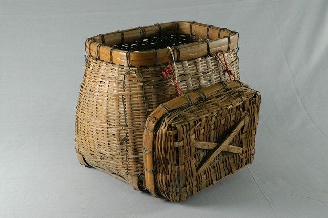 1.本物件為竹製品,呈現水壺狀,編織方式為條紋交叉編織縛紮而成,下方為方型底座,物件上方有一大方型開口,屬於不同編織方法,魚籠旁邊並繫上兩條紅色棉線連結魚籠蓋子。 2.魚簍為放置漁獲的器具,在捕魚或是釣魚時使用,籠頸處綁上細繩可繫在捕魚人的腰間隨身攜帶,籠口較小且高的設計也可防止漁獲跳出。